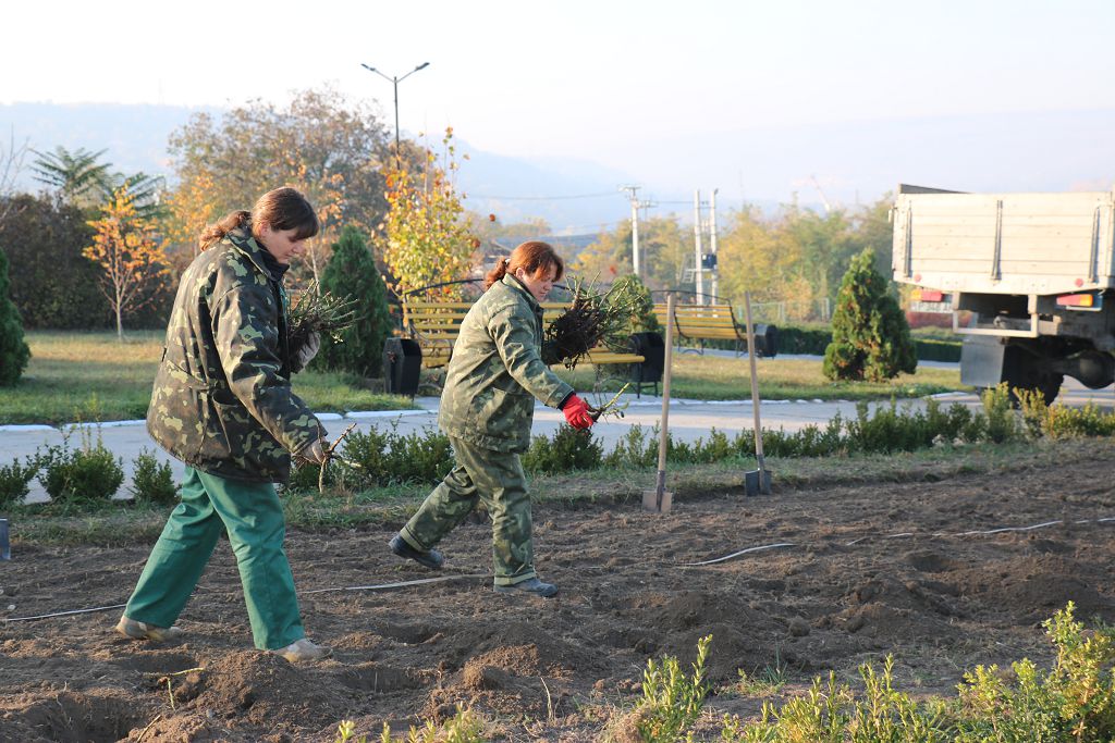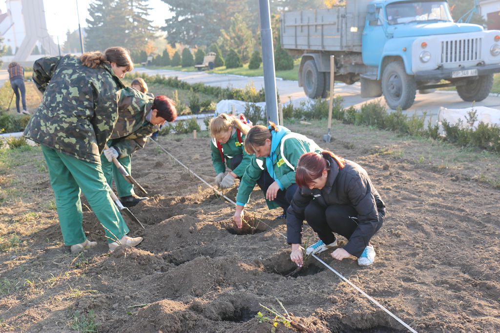 «Сначала были подготовлены посадочные места: перекопаны клумбы, сделана их разбивка, выкопаны ямы, и с поливом высажены кусты роз. В начале октября две клумбы, расположенные на Мемориальном комплексе, были окантованы кустами буксуса. Для этого было использовано 450 штук этого кустарника. А приобретены они за счет средств территориального экологического фонда. Работы по посадке буксуса еще на двух клумбах были произведены весной нынешнего года», – отметила Елена Мукан.