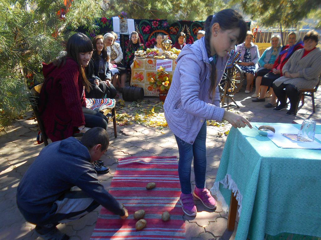 Покровские посиделки не обходились без веселых игр. Так в ходе мероприятия его участники отправились в «сказочный лес» по грибы и ягоды, где надо было собрать только съедобные (вырезанные из бумаги) грибы и ягоды. Отлично справились с заданием М. Изверская и З. Юрковская. В игре «Собери картошку ложкой» отличились дети Саша Бедняк и Денис Сучков.