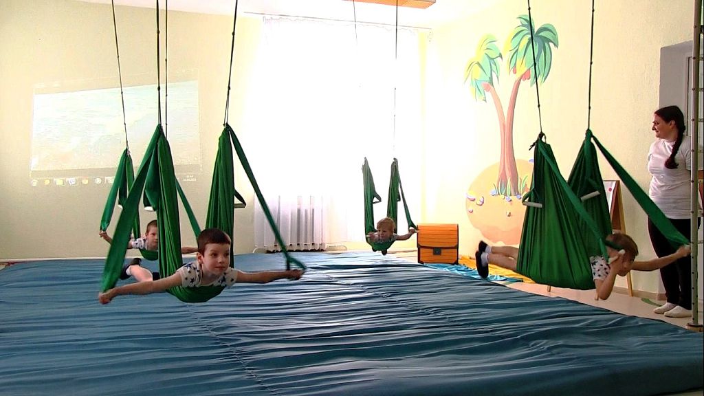 В группе слышны звуки прибоя, а малыши раскачиваются на ярко-зелёных гамаках. Со стороны всё напоминает отдых на берегу моря. Но это занимаются маленькие йоги! Правда, все асаны малыши делают в воздухе. Флай-йога или йога в гамаках объединяет в себе полёт, тренировку и расслабление.