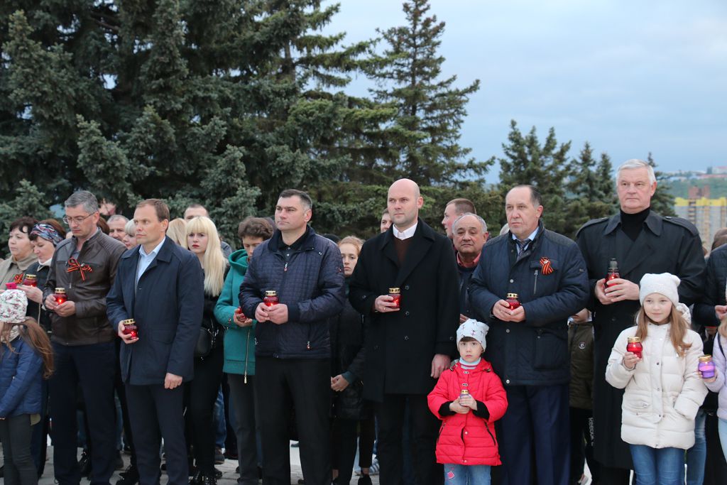 Память о тех, кого забрала война, почтили минутой молчания. В руках у участников акции мерцали огоньки лампадок, которые они положили к Вечному огню и мемориальным плитам с именами погибших рыбничан.