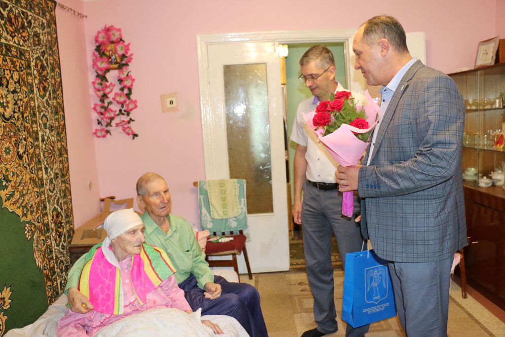 Сергей Костюк пожелал Елене Федосеевне и Василию Петровичу крепкого здоровья, мира и благополучия, вручив цветы и подарок.