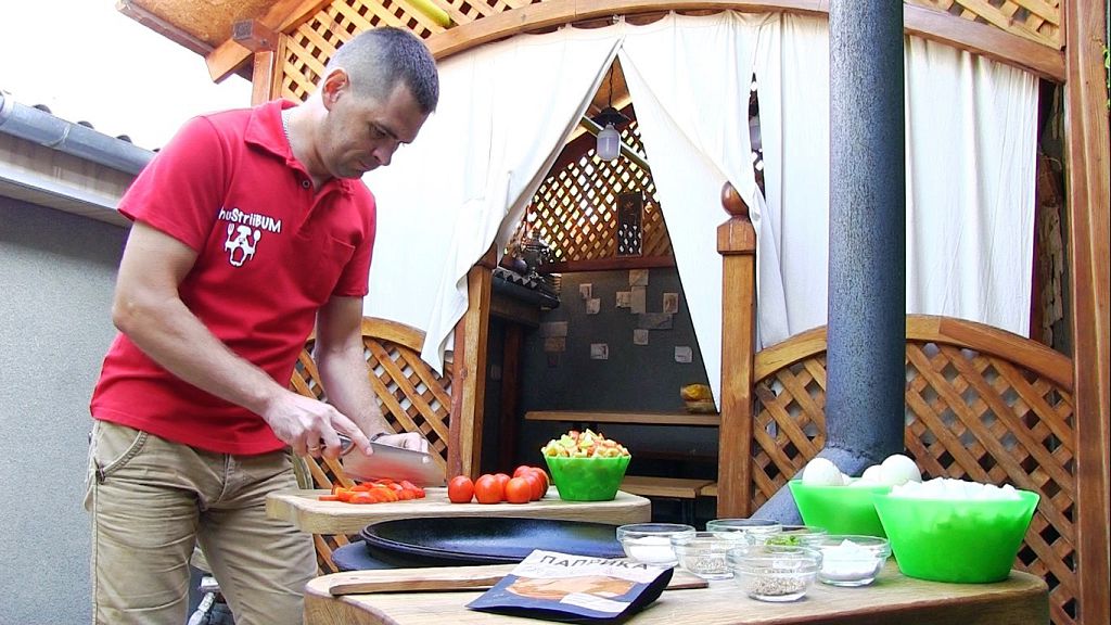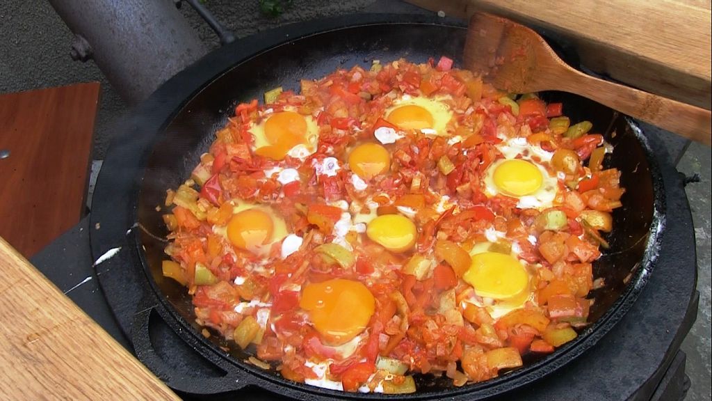 Наш герой разводит огонь в мангале, из трубы пошёл дымок. Фуд-блогер поделился секретом приготовления шакшуки – израильского завтрака. Это яичница с овощами.
