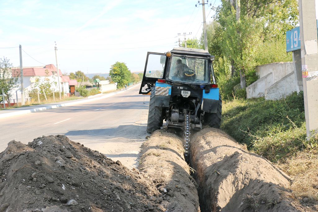 Село Ержово, улица Ленина. Здесь работают специалисты филиала ГУП «Водоснабжение и водоотведение» в г. Рыбнице. Метр за метром, двигаясь вперёд, трактор с насадкой бара оставляет за собой ров. Вскоре на дно рва будет уложена полиэтиленовая труба.