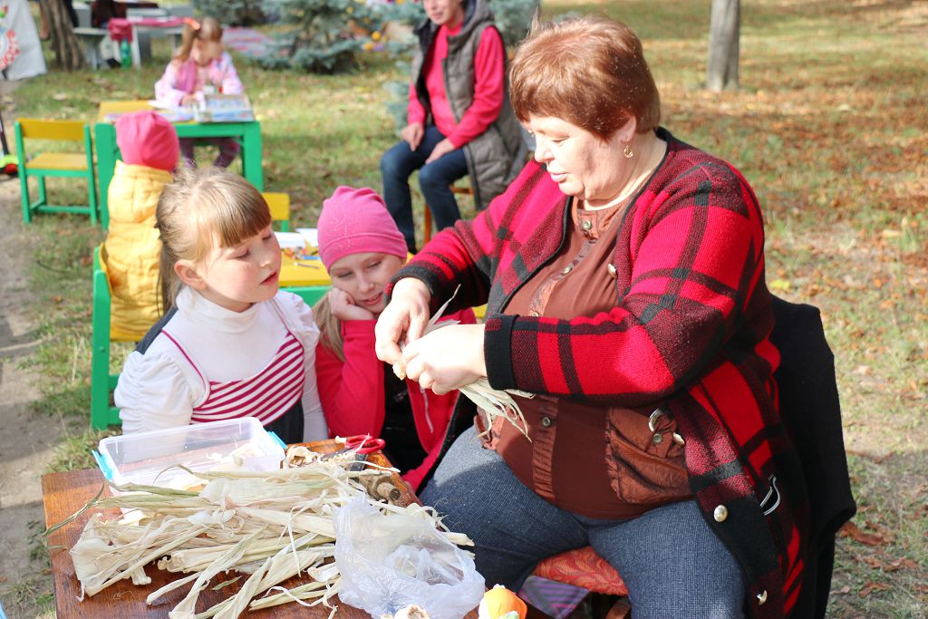 Вот например, две озорные девчонки удобно устроились за столиком рядом с улыбчивой тётей. Она показывала желающим, как можно изготовить сувенир из листьев кукурузы. Улыбчивая тетенька – это Татьяна Галак, участница клуба «Мастерица», который работает при Рыбницкой Центральной библиотеке. Девочки с удовольствием следили за умелыми руками мастерицы. Полчаса работы и вот человечек из листьев кукурузы готов – всё это на площадке Рыбницкой централизованной библиотечной системы.