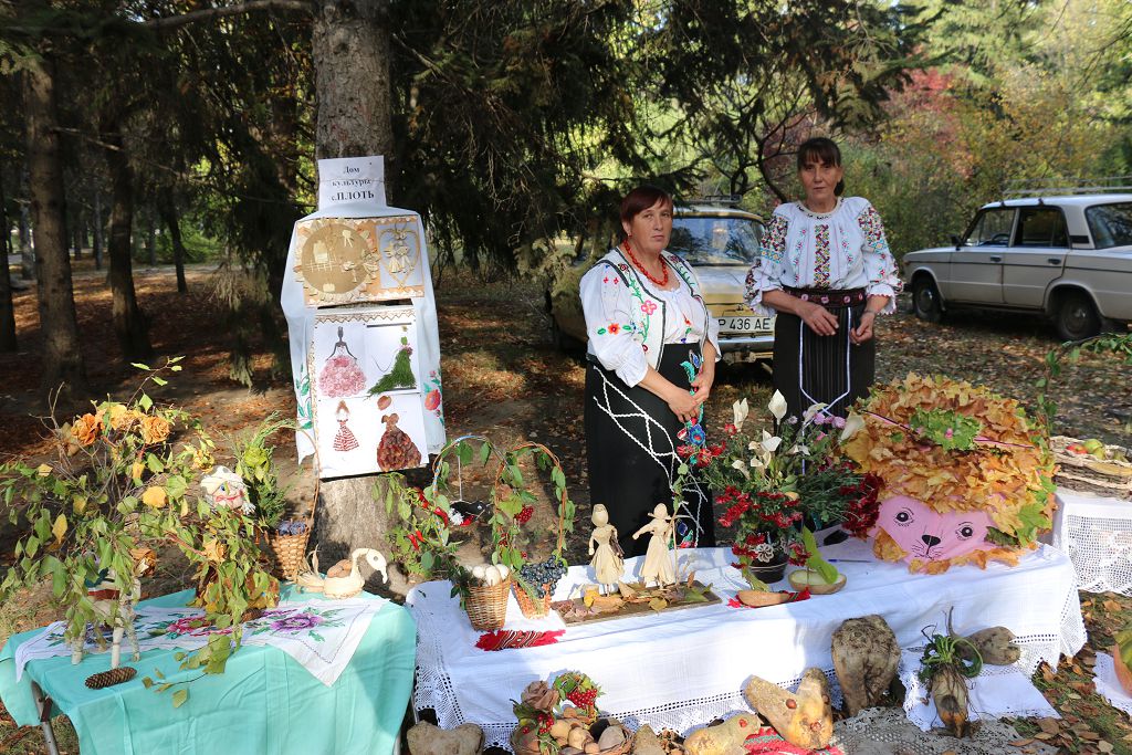 Очаг культуры с. Выхватинцы привёз на фестиваль «мужчину» и «женщину» из тыквы. Они с любопытством рассматривали подходящих поглядеть на них. Отсчитывали время часы из каштанов и зерна кукурузы. А вот площадка Дома культуры села Плоть. Здесь красуются два сельских труженика, изготовленных из листьев кукурузы, и довольная барышня в платье из листьев. Свои творения представили и мастерицы с. Воронково – восхитительные работы декоративно-прикладного творчества.