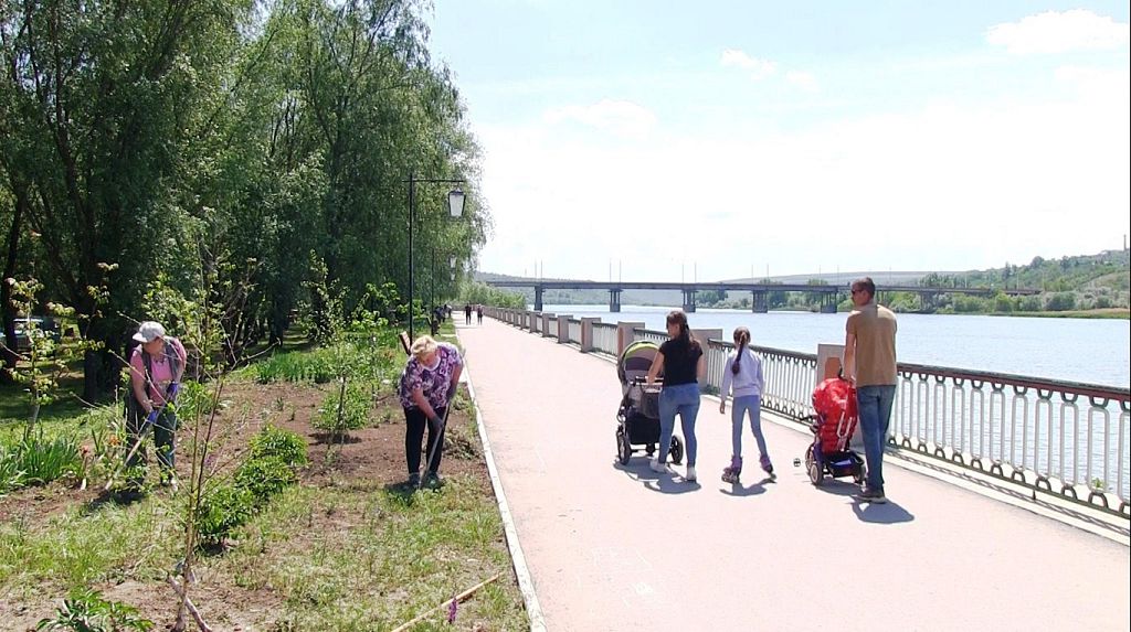 Зазеленела и городская набережная. В новом сквере появились дорожки и альпийская горка. Здесь высажены туи, спиреи, жасмин и барбарис. У воды уже отдыхают люди.
