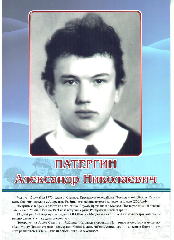 В Рыбницком музее Боевой славы хранятся личные вещи погибших, фотографии и документы. Есть в музее письма, которые Александр Патергин писал невесте из армии. Особое внимание на себя обращают два документа – свидетельство о смерти А.Н. Патергина от 13 декабря 1991 г. и о рождении его сына, который появился на свет в день гибели отца и был назван в его честь Александром. Первыми жертвами вооруженного конфликта среди рыбничан стали Александр Патергин, Владимир Щербатый и Юрий Цуркан.