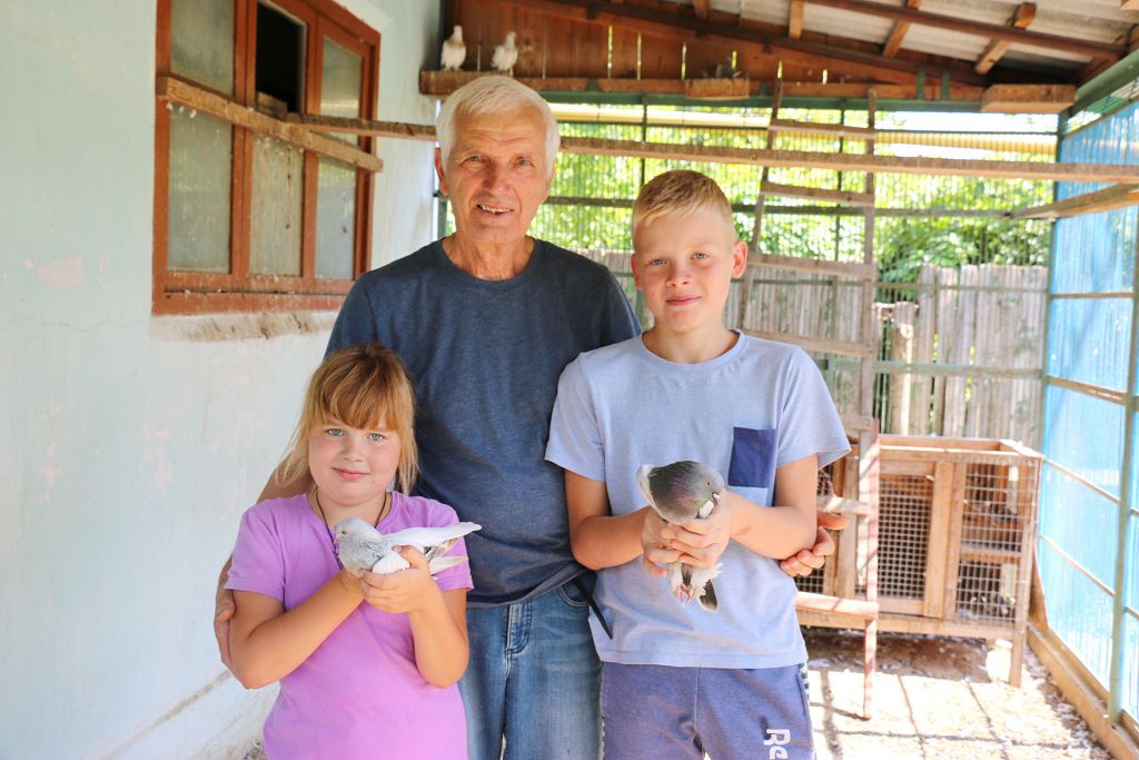 И вот Илья Степанович приглашает знакомиться с его питомцами. Сначала мы в сопровождении внучки и внука моего собеседника вошли в вольер. Голуби спокойно гуляли, лишь изредка настороженно поглядывая на меня, к остальным своим гостям они уже привыкли. Поняв, что я не представляю для них опасности, продолжили заниматься своими голубиными делами – кто-то ухаживал за птенцами, кто-то прихорашивался, чистя перья, а другие просто о чём-то «болтали».