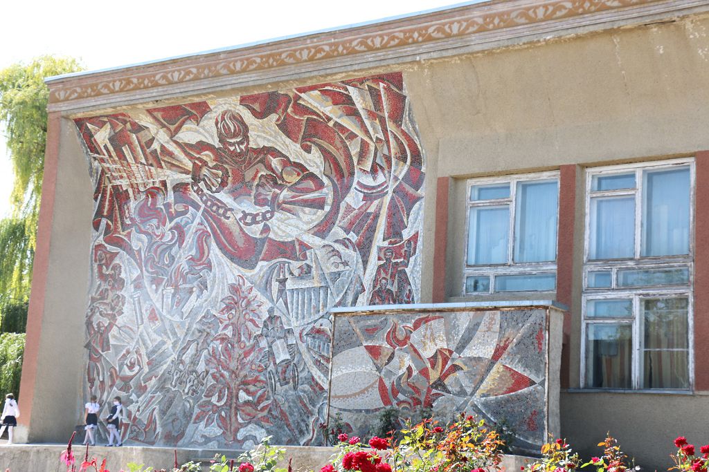 Если не рассматривать огромное панно внимательно, с первого раза даже не поймешь, что там изображено, – вот тракторист на тракторе, неподалеку группа людей, а еще в глаза бросается мужчина, разрывающий цепи оков.