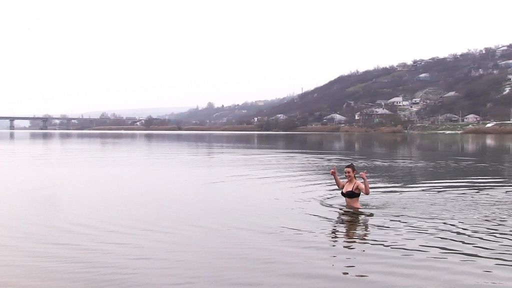 На набережной снег и лёд, но на удивление пляж не опустел. В северной столице девушки настолько закалённые, что плавают в Днестре, когда на улице минус. Анна Носова – рыбницкая Снегурочка. Купание в ледяной воде у неё не вызывает дрожь, а только улыбку. Моржеванием девушка занимается уже 6 лет.