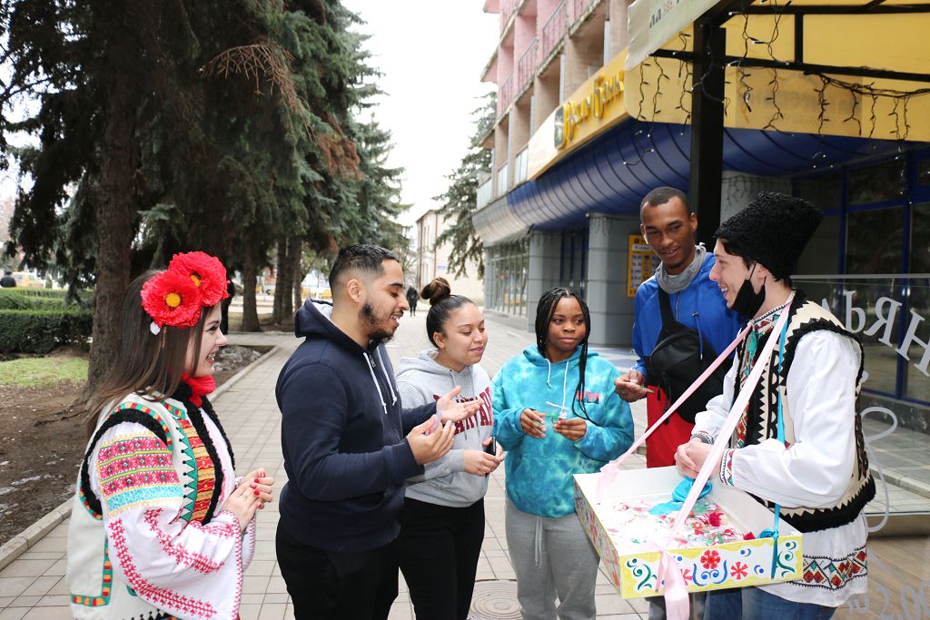 Молодые люди поздравляли жителей и гостей города с началом весны и вручали прохожим символы весеннего праздника, желая мира, добра и здоровья.
