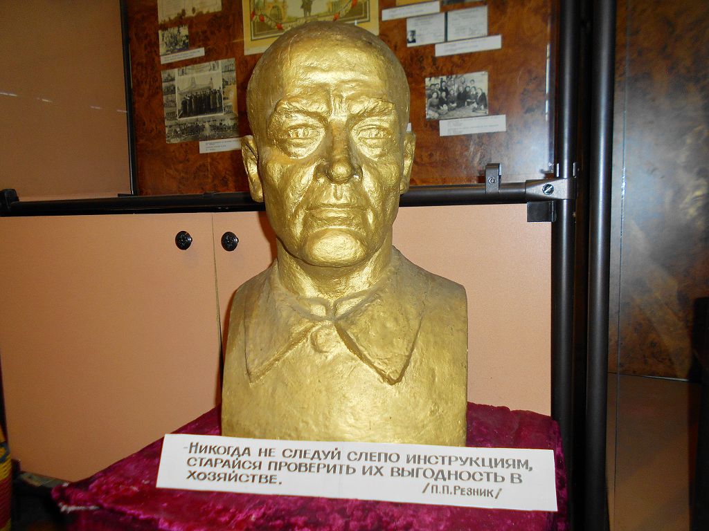Рассматривая экспонаты, обратила внимание на бюст мужчины, взгляд которого устремлён куда-то вдаль. От фигуры веяло решительностью и твёрдостью. По крайней мере так увидела и почувствовала я. Возле бюста слова: «Никогда не следуй слепо инструкциям, старайся проверить их выгодность в хозяйстве», а под ней подпись: «П.П. Резник».