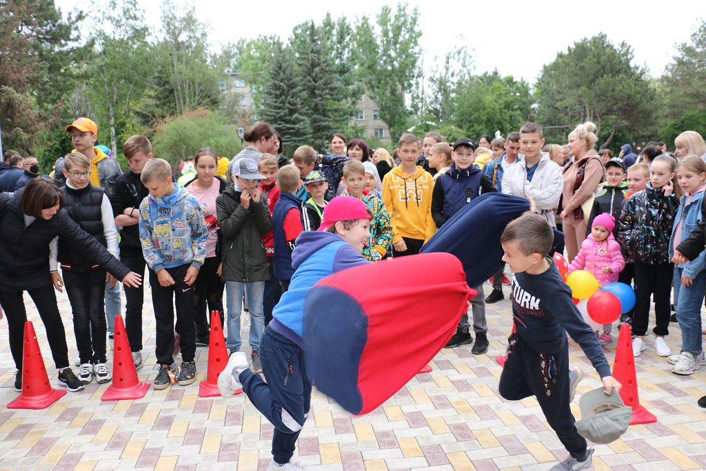 Юные рыбничане с большим удовольствием принимали участие в спортивно- игровой программе, организованной Управлением физической культуры и спорта, в частности развлекательной эстафете, богатырских боях с мешками, весёлом дартсе.