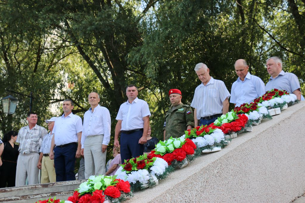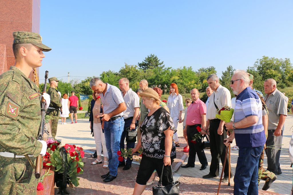 Погибших защитников вспомнили поимённо. Объявлена минута молчания. К памятнику и именным плитам были возложены венки и цветы.