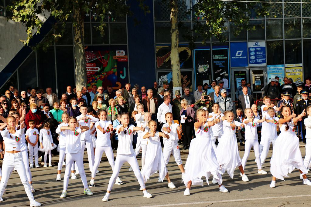 На главную площадь высыпали дети с яркой танцевальной композицией, посвященной Приднестровью.