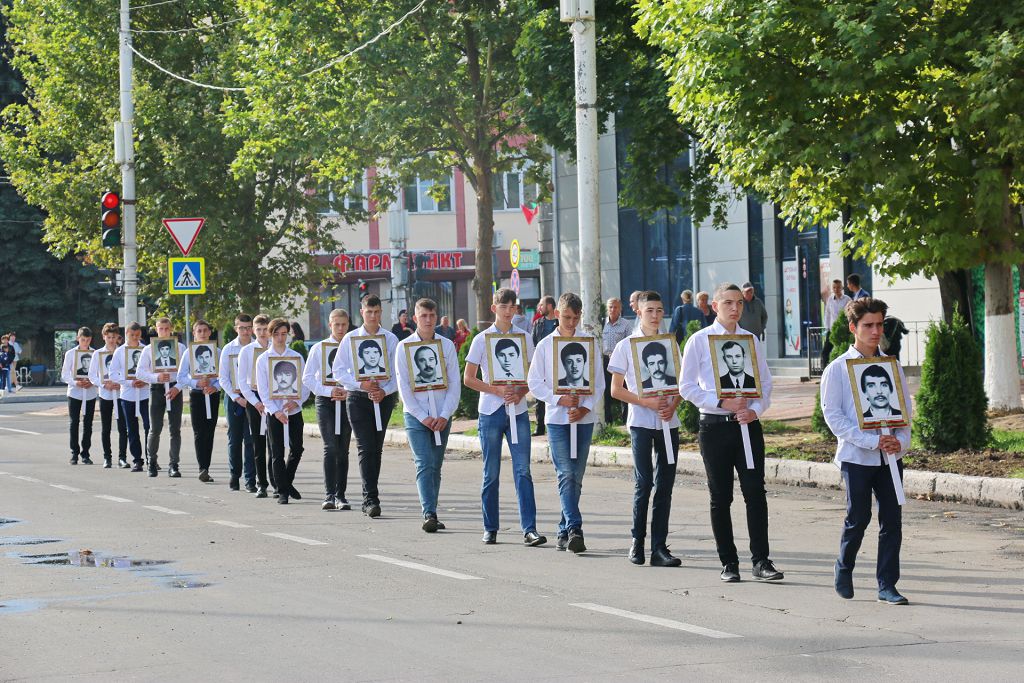 Под скорбные звуки скрипок на площадь вышли юноши с портретами рыбничан, погибших, защищая созданную волей народа республику на Днестре.
