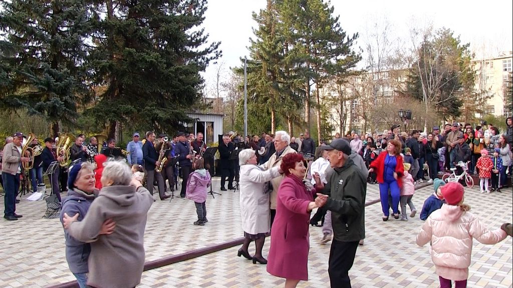 Струи фонтана поднимаются в такт духовому оркестру. Живая музыка и почти летнее настроение тут же наполнили парк отдыхающими. Рыбничане рады открытию фонтана: