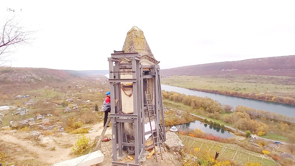 Новая колонна тоже из природного камня, весит около тонны. «Башня ветров» расположена на крутом каменистом склоне, техника сюда не заедет. Колонну спускали с помощью ручного механизма. Благодаря каркасу приподняли верх башни и установили новую колонну. Это ювелирная работа, ведь здесь ни капли цемента, рассчитали до миллиметра.