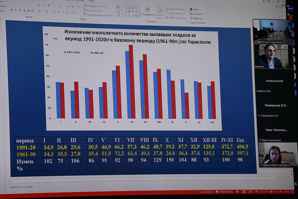 Доклад директора ГУ «Республиканский гидрометцентр» Виталия Кольвенко на тему «Современное глобальное потепление на фоне прошлых климатических изменений в Приднестровье и мире» был основан на глубоком анализе новых данных по ПМР. Виталий Витальевич как климатолог по специальности пояснил, что о климатических изменениях можно говорить, анализируя период не менее 30 лет. За базовую основу взят период с 1961 по 1990 годы. С ним сравнили новый период с 1981 по 2020 годы по температуре воздуха и осадкам. Картина получилась, увы, не обнадеживающая: летние месяцы в среднем потеплели на 2 градуса по Цельсию, а это очень много, говорят специалисты. В северных районах нашей республики наблюдается стабильный рост среднегодовых температур воздуха. «Потепление на территории Приднестровья продолжается, годовая температура с 1981 по 2020 годы (по сравнению с базисной) выросла на 0,9 градуса по Цельсию. При этом общее многолетнее годовое количество осадков существенно не изменилось. Серьёзные изменения наблюдаются в распределении выпавших осадков по месяцам (в октябре рост на 50%, а в феврале уменьшение на 25%). В целом изменения температуры воздуха в Приднестровье в рассматриваемые периоды близки к глобальным», – сделал выводы Виталий Кольвенко.