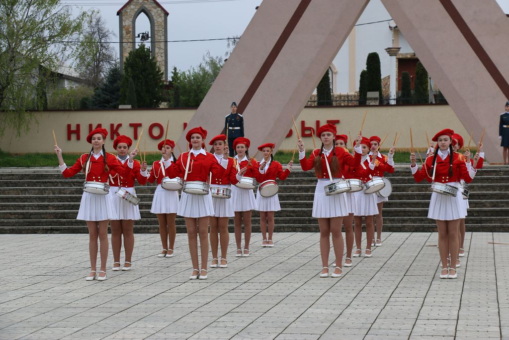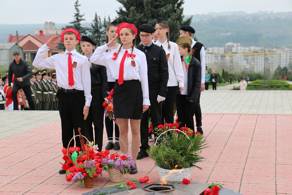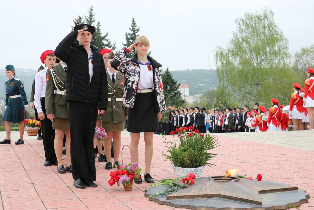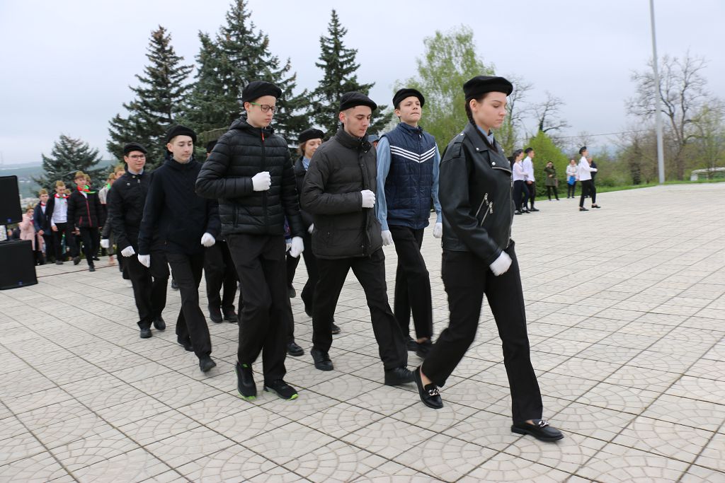 Юнармейские отряды выстраиваются по обе стороны мемориала. Первыми на священное для каждого жителя города место вступают победители республиканской детско-юношеской спортивно-патриотической игры «Юный патриот Приднестровья-2019 года» команда Рыбницкой СШ №9.