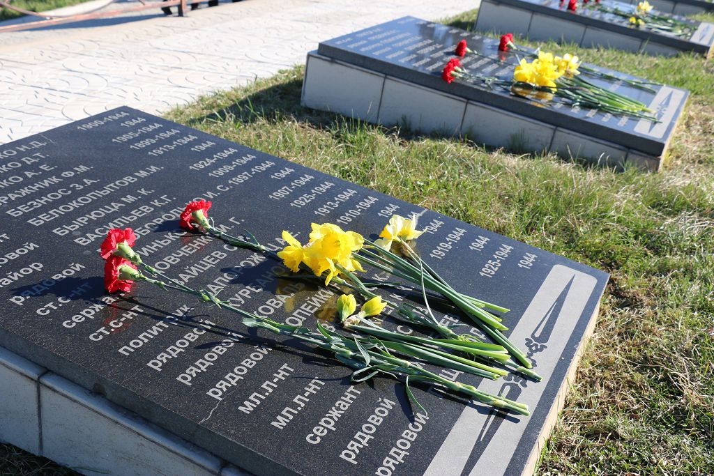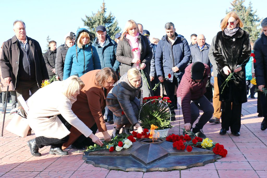 Присутствующие на мемориальном комплексе замерли в минуте молчания. К Обелиску Славы и гранитным плитам с именами павших воинов возложили живые цветы.