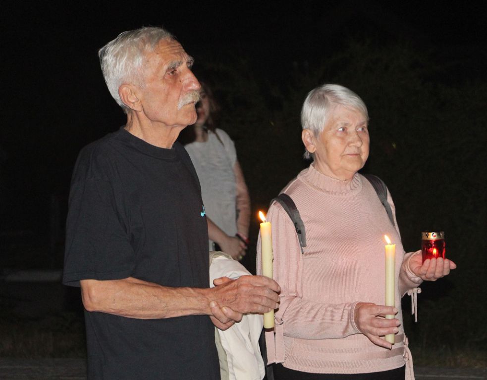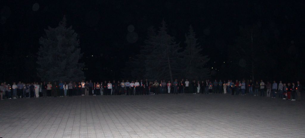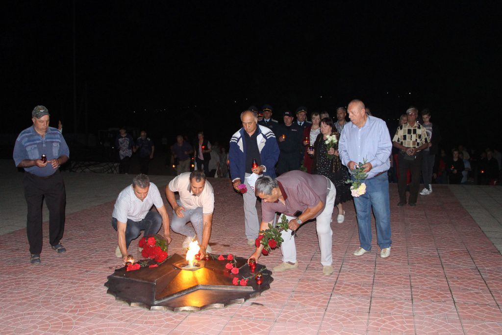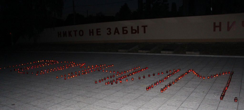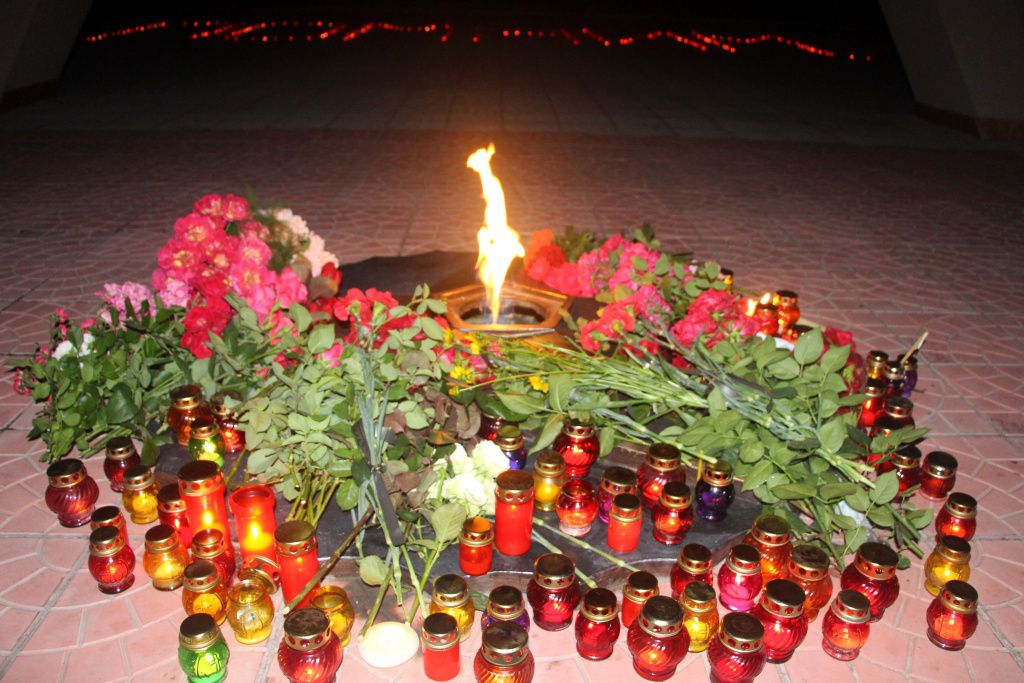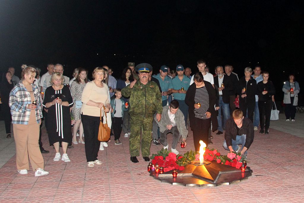 Из зажжённых лампадок выложено «Скорбим… 82». Горели лампады и в руках благодарных потомков. Мерцают огоньки как символ вечной памяти и скорби о всех, кто не вернулся с полей сражений, чьи судьбы безжалостно перемололи жернова войны.