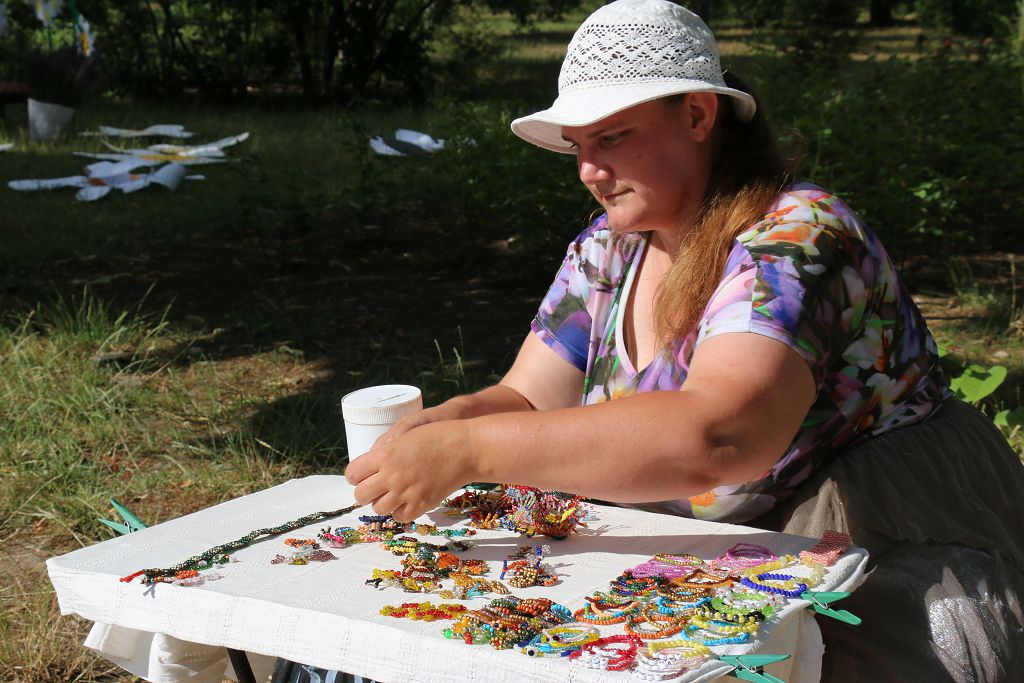Ближе к началу массовых мероприятий Ольга Агапова стала аккуратно раскладывать на импровизированных прилавках изделия ручной работы из бисера. Плетением молодая женщина занимается с десяти лет, хобби постепенно превратилось в способ заработка. «Из бисера я плету браслеты, броши, брелоки. На праздники я обязательно выхожу торговать своими изделиями, даже имею постоянных клиентов», – поделилась Ольга. Живёт мастерица на ул. Вальченко, часто выходит к набережной, где находит покупателей.