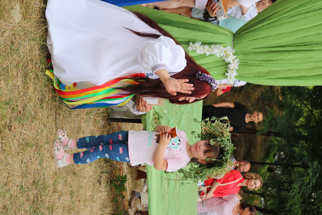 Затем в центр поляны вынесли чучела Купалы и Костромы (деревце). Девушки водили хоровод, а затем приступили к плетению венков – такую красоту надо было показать всем. Самые маленькие красавицы и мальчики приняли участие в дефиле по импровизированному подиуму и получили в подарок сладкое лакомство.