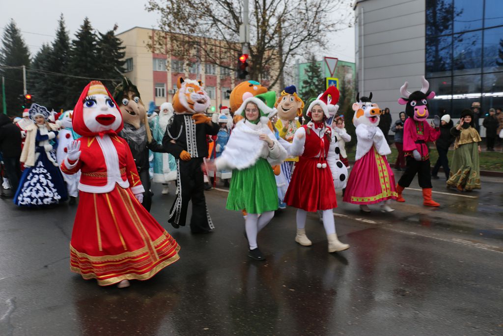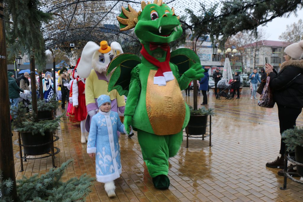 Открылось праздничное мероприятие парадом героев известных сказок. Сколько по главной улице города шествовало дедушек с бородой в красных и синих кафтанах с большими посохами, не сосчитать! И каждый обещал детворе исполнить заветное желание в новогоднюю ночь. И ведь определённо – исполнят из такого множества хоть один. Волшебники в праздничном шествии были совсем не одиноки, компанию им составили, конечно, снегурочки и многие другие сказочные герои, звери и персонажи любимых детских мультфильмов. Прохожие радостно приветствовали шумную процессию. По всему маршруту колонну сопровождали желающие сфотографироваться.