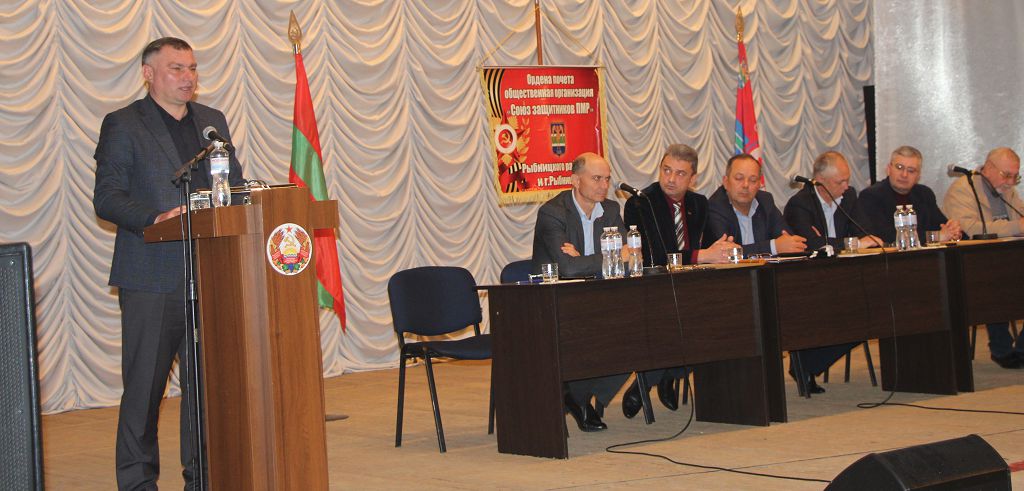 В субботу 27 апреля в большом зале Дворца культуры прошла отчётно-выборная конференция Союза защитников ПМР города и района. В работе конференции приняли участие глава государственной администрации Рыбницкого района и г. Рыбницы Виктор Тягай, заместитель главы госадминистрации Юрий Молдовский, депутат ВС ПМР Вадим Кравчук, заместитель председателя Совета народных депутатов Олег Вендичанский, председатель ОО «Союз защитников ПМР» Валерий Широков. Вёл конференцию Дмитрий Коротков.