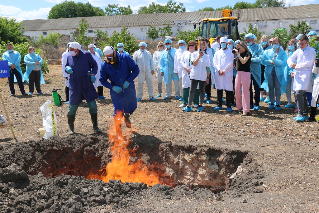 Затем вся погибшая птица была отправлена в яму, где ее сожгли, а место обработали хлором и только после этого закопали с помощью бульдозера.