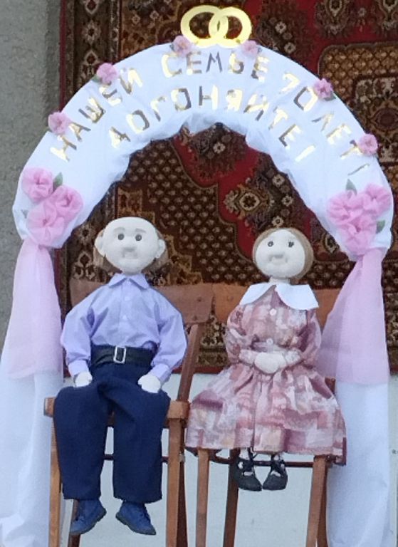 Заведующая библиотекой Наталья Чебан представила выставку книг и журналов на тему мероприятия. А Наталья Пыслараш для оформления мероприятия предоставила кукол «Жених и невеста», а также оформила фотовыставку всех юбиляров.
